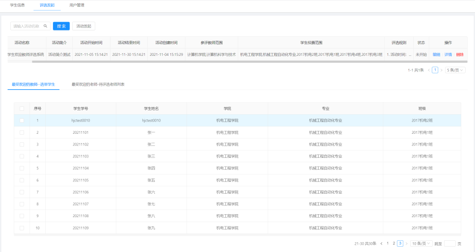 “以前評選要收幾百張紙質(zhì)選票,統(tǒng)計起來得加班到深夜,現(xiàn)在系統(tǒng)自動匯總,連哪個專業(yè)投票率最高都一目了然。”談及教師評選系統(tǒng),延安大學(xué)評估處老師這樣感慨。這款覆蓋PC端與移動端的評選平臺,構(gòu)建了從活動發(fā)起至結(jié)果應(yīng)用的全流程管理體系。