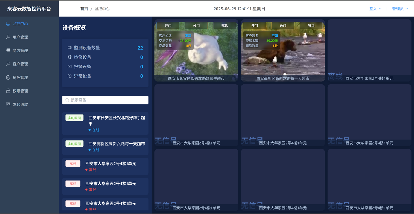 平臺以人工智能技術(shù)為驅(qū)動,全面賦能零售運營場景。通過AI數(shù)字人客服系統(tǒng),實現(xiàn)擬人化交互與全天候智能響應(yīng),顯著提升服務(wù)效率并降低人力成本。同時,依托計算機(jī)視覺與智能數(shù)據(jù)分析技術(shù),平臺可精準(zhǔn)識別商品、實時同步交易信息、動態(tài)生成運營洞察,為商戶提供數(shù)據(jù)驅(qū)動的決策支持,構(gòu)建智能化、自動化、可追溯的零售運營新范式。平臺實現(xiàn)了客戶掃碼開門、客服遠(yuǎn)程開門、門禁狀態(tài)監(jiān)控、攝像頭監(jiān)控、門店網(wǎng)絡(luò)監(jiān)控、音視頻通話、數(shù)字人交互、店鋪信息同步、訂單信息同步、退款發(fā)起、系統(tǒng)管理等全業(yè)務(wù)流程的數(shù)字化管控,并通過與ERP系統(tǒng)的深度協(xié)同,打通“出入管理-銷售交易-庫存管理-財務(wù)管理”的全鏈路,構(gòu)建“無人值守+智能服務(wù)+數(shù)據(jù)驅(qū)動+統(tǒng)籌管控”的新型零售運營模式。