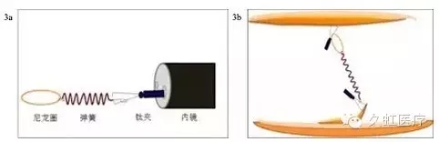 2009 年兩位日本學者 Sakamoto 和 Osada 以彈簧、金屬夾和尼龍圈為基礎設計出另一種體內(nèi)牽引技術,并以兩人名字的首字母命名為 S-O 金屬夾牽引技術。該方法由金屬夾彈力圈聯(lián)合牽引法衍變而來,以彈簧替代彈力圈,力求獲得更大的伸縮性,來適應大的、表淺性的結腸早期腫瘤的 ESD 切除(圖 3)。