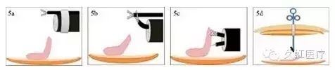 3. 另外一種更直接的方式是,把第二枚金屬夾與絲線同時固定于對側黏膜上,使剝離組織產(chǎn)生來自對側的張力,見圖 1c。但此種方法仍存不足,一是絲線本身只能提供定向拉力;二是絲線本身沒有收縮性,隨著剝離面的加大,絲線的張力會減小,其作用會隨之減弱或消失。